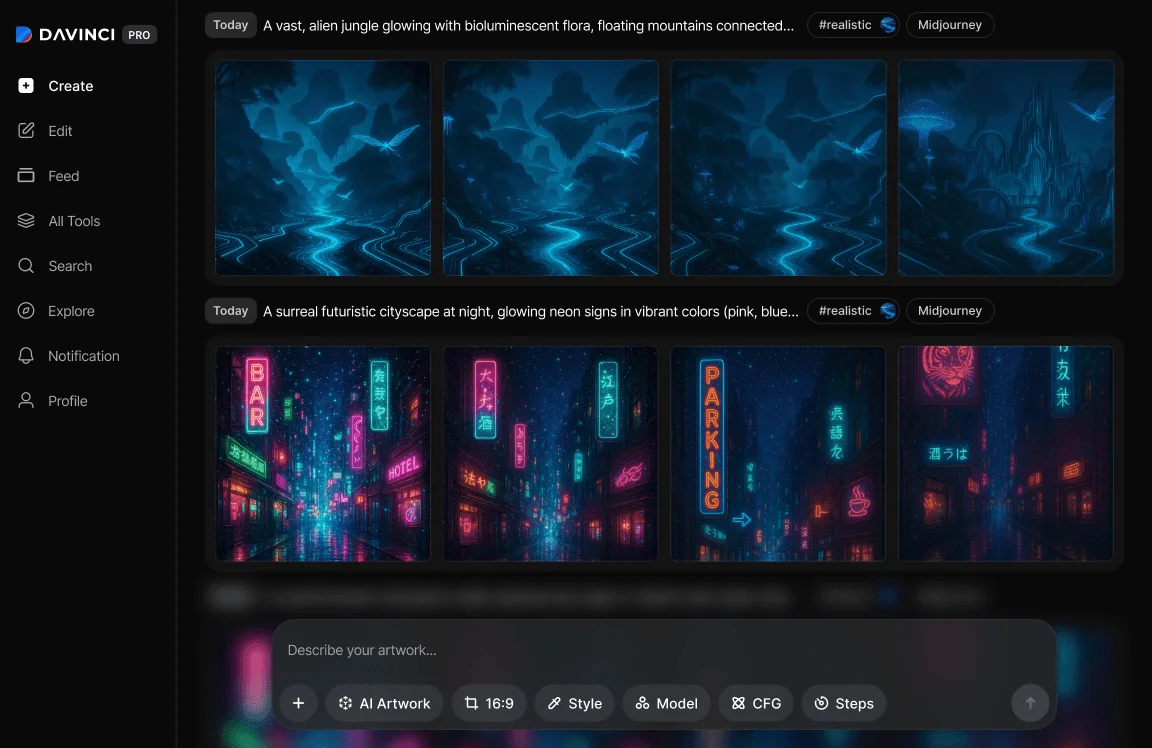 DaVinci features the latest state-of-the-art AI technology to generate unique artworks and photorealistic images. It offers various AI models to choose from, including its own custom AI model, DaVinci XL, Stable Diffusion, DALL·E 3. Try our AI art generator tools now to create breathtaking AI-generated art.